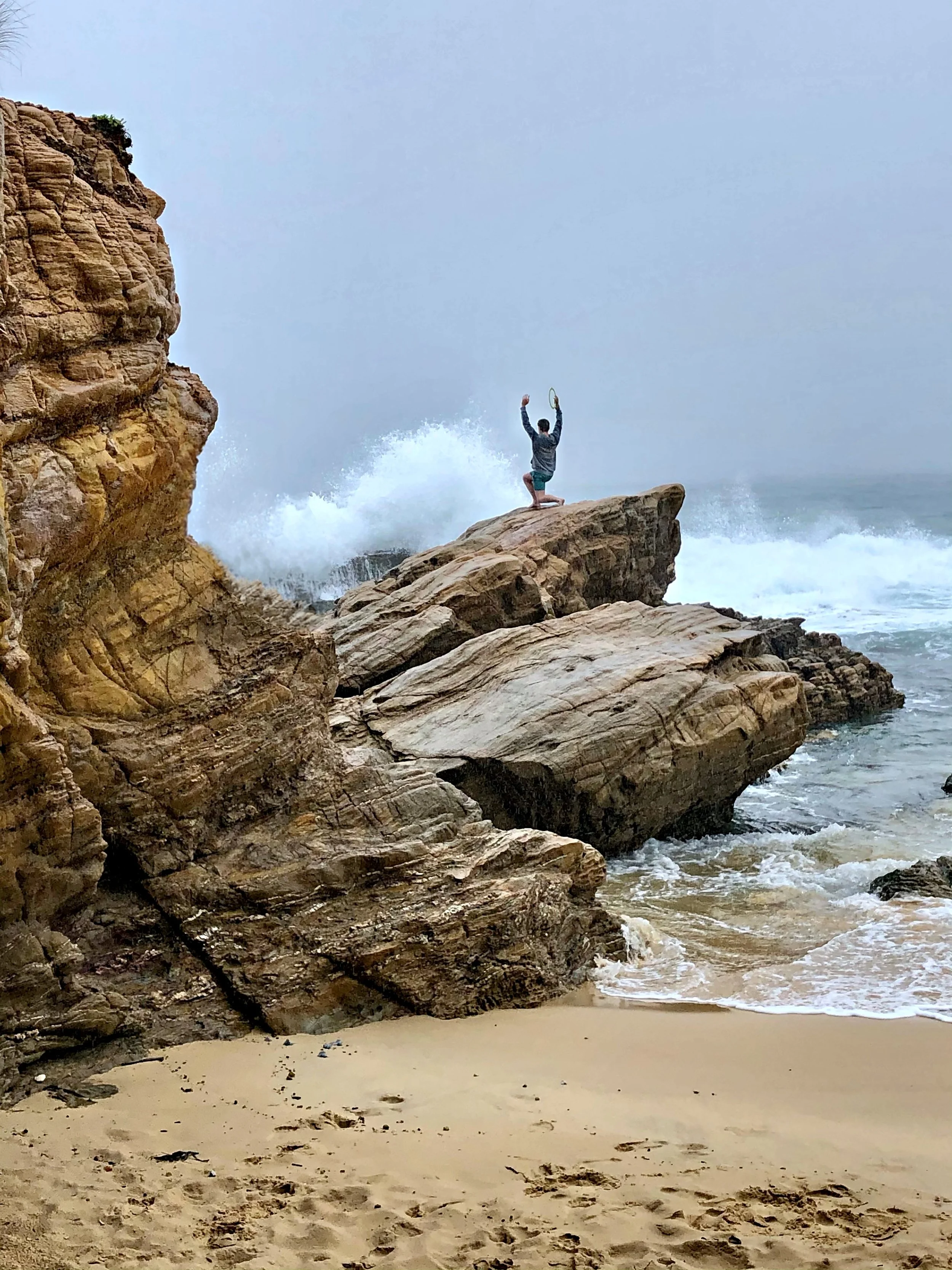 Above all, this was an opportunity to relax a little and to recharge, and Dan was still recovering slightly from having put a chainsaw through his left foot, but that did not mean that there were no adventures to be had. We found ourselves at Beares Beach one dramatic day when grey skies and drizzle gave way to strong rain and storms with a wild sea sending crashing waves ashore. Luckily we discovered a splendid sea cave in which we could take shelter.